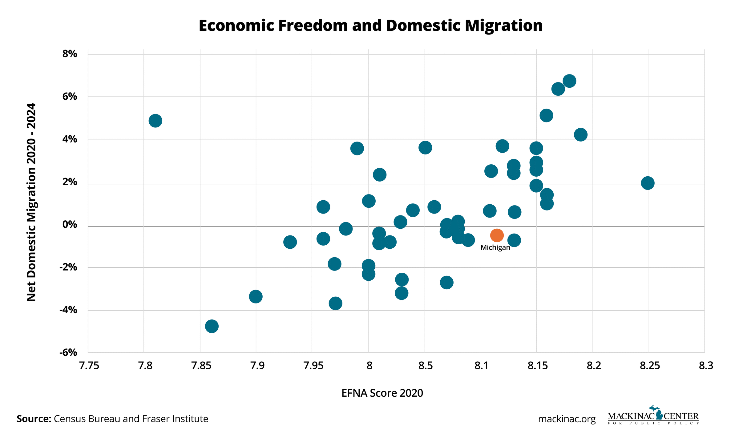 The chart below looks at a measure of each state’s economic freedom compared to its net domestic migration. The Fraser Institute’s Economic Freedom of North America score is measured against Census Bureau population data. Each state is represented by a dot. That all the states are clustered around a trend moving up and to the right suggests that states with more economic freedom attract more people.