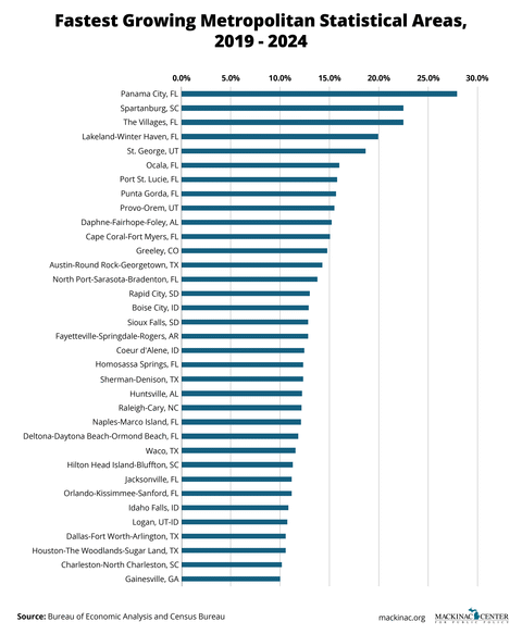 The fastest growing Metropolitan Statistical Area is the Panama City, Florida, region. Its population increased from 176,800 people in 2019 to 226,200 in 2024, or 28%.