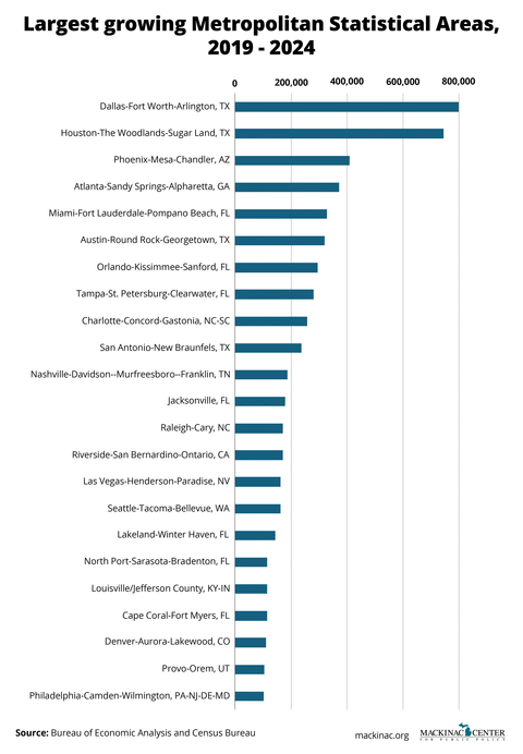 Michigan’s population has been stuck in the same spot for a generation, and Gov. Gretchen Whitmer wants to change that. Her population committee delivered a report and her growth office is handing out grants to do something to attract and keep more people in the state. It’s been two years since Whitmer created her task force, and it’s time for state officials to reassess their strategy. They should start by looking at the places around the country that are growing and notice that they are not the ones you might expect.