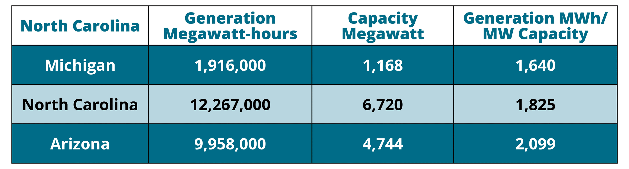 Michigan has lower solar resource potential than more southerly located states, as shown below. Michigan is about 10% less productive at generating electricity through solar than North Carolina and 21% less efficient than Arizona. This translates to Michigan having 28% higher costs to generate solar electricity than Arizona. In 2024, Michigan’s solar projects generated 71% less electricity in December than in June (62 megawatt-hours/ megawatt vs. 212).