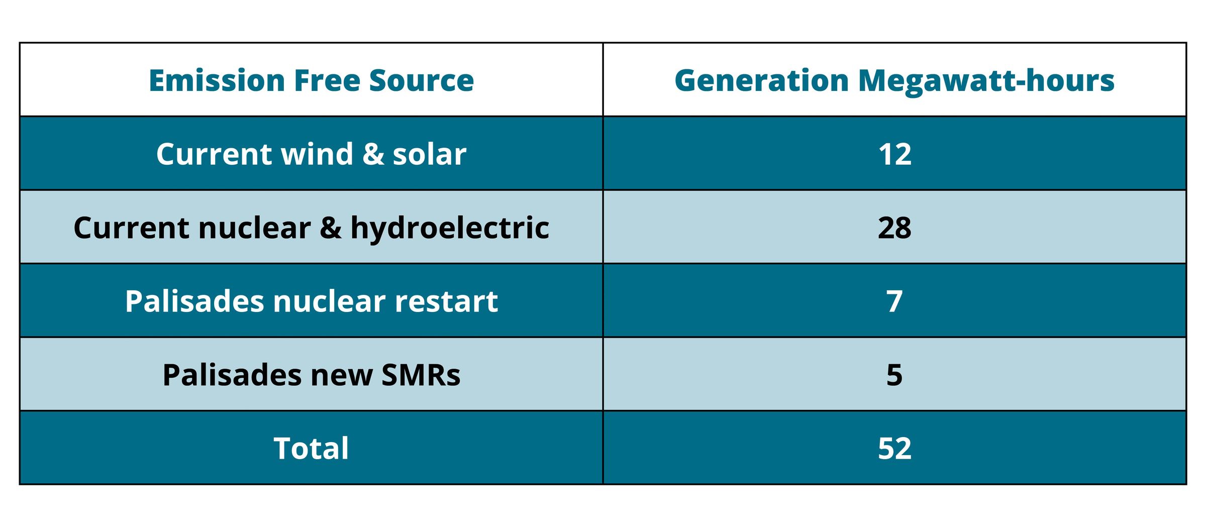 Michigan’s electric demand was 98.8 million megawatt-hours in 2024. Solar generation only totaled 2.3 million, or about 2% of that. The state’s goal of generating 52% of demand, or 52 million megawatt-hours, from zero-emission sources by 2030 could be achieved by adding a new small modular reactor at the Palisades nuclear plant and restarting the main plant.