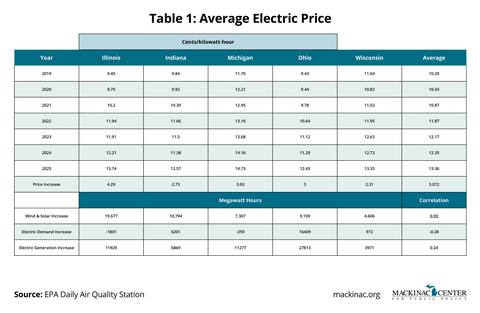 Table 1 below shows how each state fared. There is a strong correlation (0.93, compared to a perfect correction of 1.0) between how much wind and solar power was added in each state and how much electricity prices rose. Renewable energy proponents often tie electric price increases to rising demand or changes in how utilities generate electricity. This comparison shows little correlation between rising electric prices and changes in electric demand or generation for these five Midwest states.