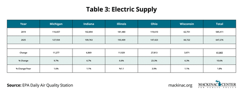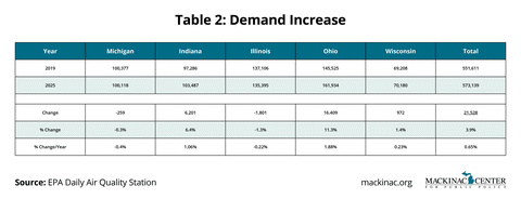 The debate over what is causing electric rates to rise comes down to a few choices. If demand rises faster than supply, it is a basic economic principle that prices will rise. But demand for electricity has risen less than 1% a year for decades. We are, though, beginning to see increased demand with the rise of data centers, electric vehicles, and some state regulations encouraging a switch from natural gas and propane appliances to electric (electrification). These changes will continue to increase demand for electricity in Michigan. The total amount of electricity demanded by the five states has increased 0.65% per year, as seen in Table 2. This correlates with rising electricity rates of only 0.28.