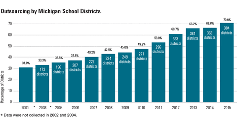 There are more Michigan public schools contracting out food, custodial or transportation services than ever, according to the Mackinac Center’s latest survey of school districts. This year, 70.8 percent of school districts use private-sector vendors to clean buildings, get kids to school, or cook and serve school meals. This is up from 66.6 percent the previous year.