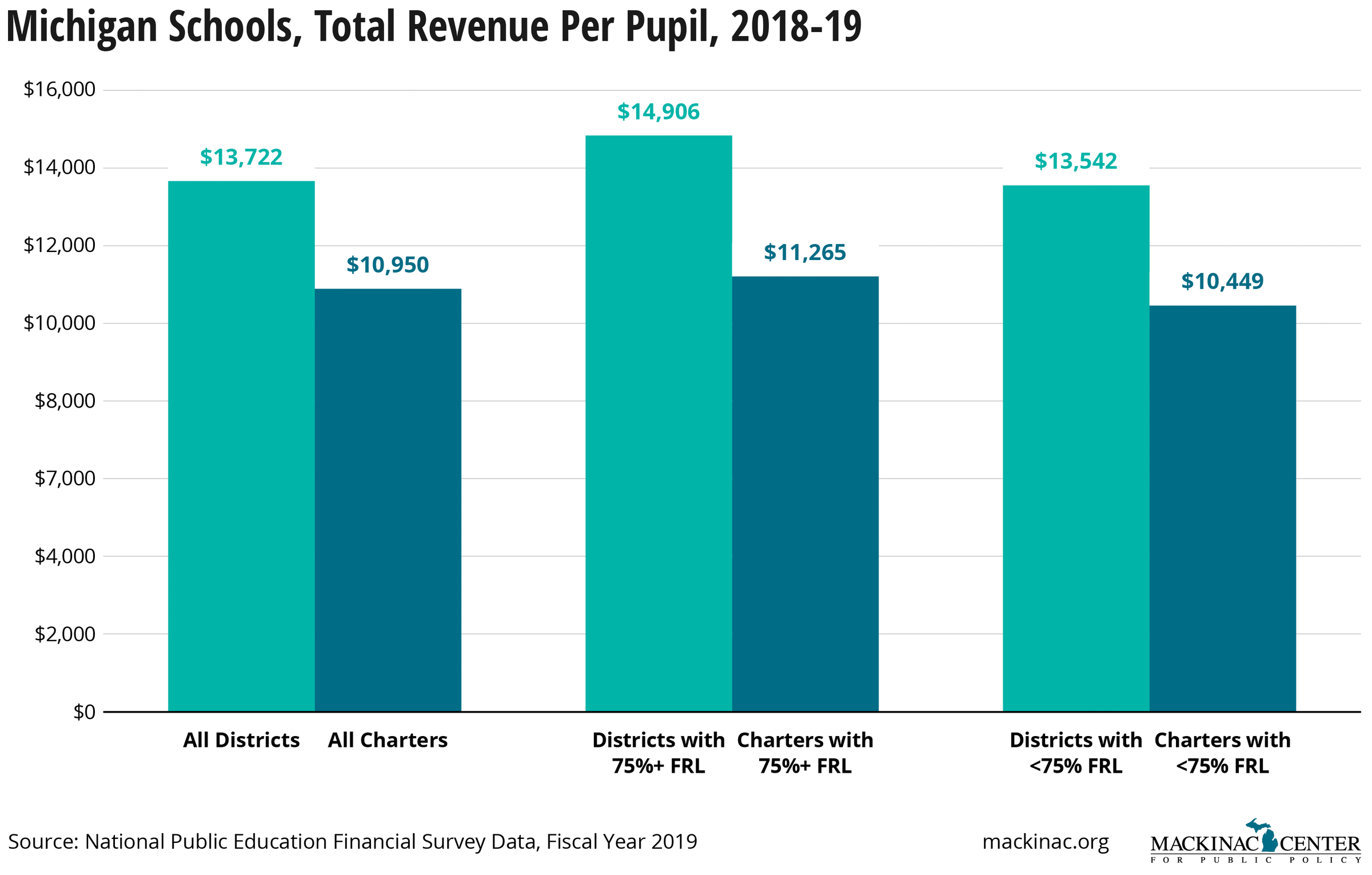 That’s a sizable difference, but it is not the largest funding gap between different types of public schools in Michigan. A much steeper difference can be found between conventional districts and the state’s charter schools, where 75% of students are economically disadvantaged. In 2019, for every three dollars charter schools received per student, districts collected four.
