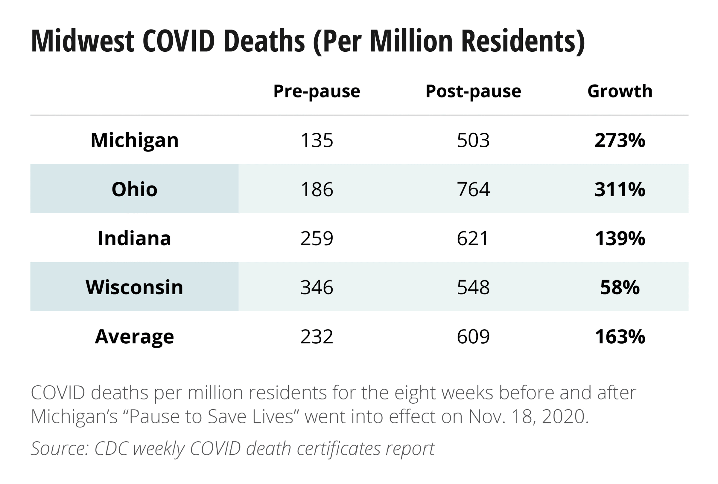 The table below shows the number of deaths per million residents over the eight-week period before Michigan’s “pause” and the same for the eight-week period after it went into effect, compared to surrounding states.