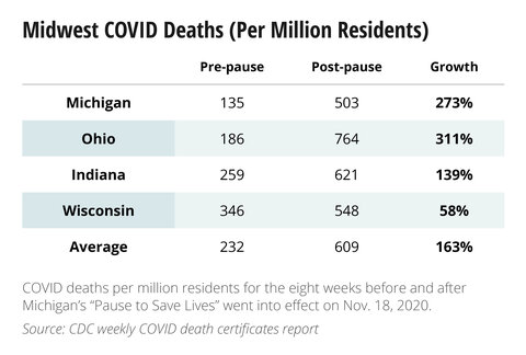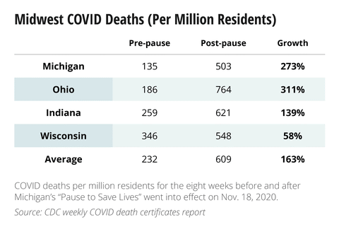 Of course, a number of factors could have contributed to these declining trends, especially since COVID cases were starting to decline before “the pause.” But comparing Michigan with nearby states with different COVID policies provides an opportunity to better assess the possible effects of the pause.
