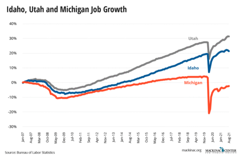Idaho and Utah lost fewer jobs in the 2008 recession, and they also grew more in the subsequent phase of growth. They lost a smaller share of their jobs when the pandemic hit and recovered the quickest among states. They outperformed Michigan at every step.