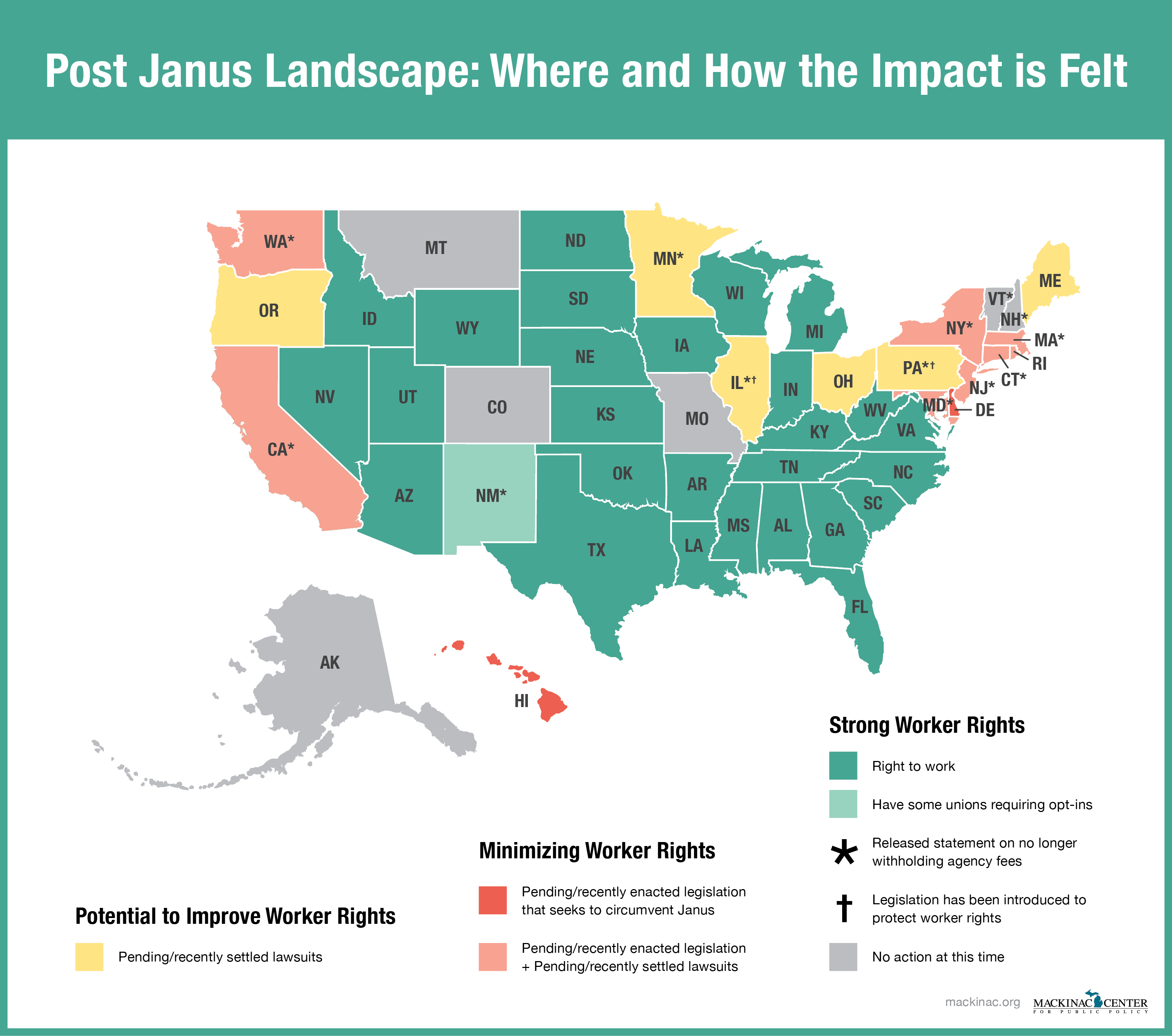If the justices rule in favor of Mark Janus, government workers across the country would not need to pay unions as a condition of employment. Workers in the 28 right-to-work states already have this right and some government workers in a few non-right-to-work states have similar rights. This means that such a decision would only affect workers in roughly half the states in the country.