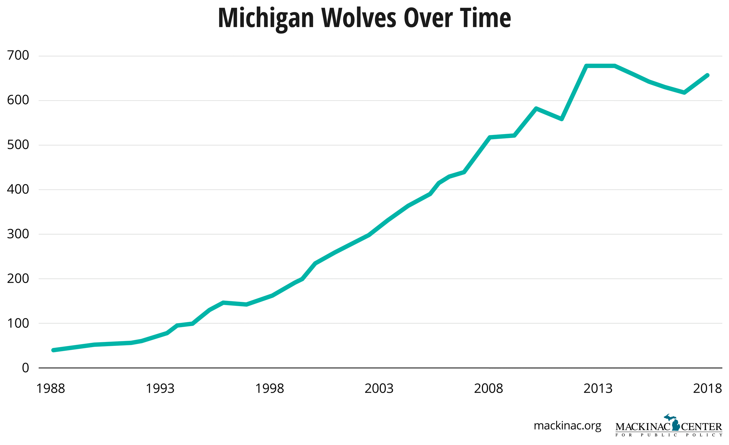 As shown in the figure below, Michigan’s wolf population steadily increased from the late 1980s to around 2010, and then leveled off. This leveling is most likely a result of wolves reaching the maximum population their food, resources and habitat can support, absent any specific human intervention. Biologists and ecologists refer to this concept as carrying capacity. We can expect a relatively stable wolf population of 600 to 700 in the future.