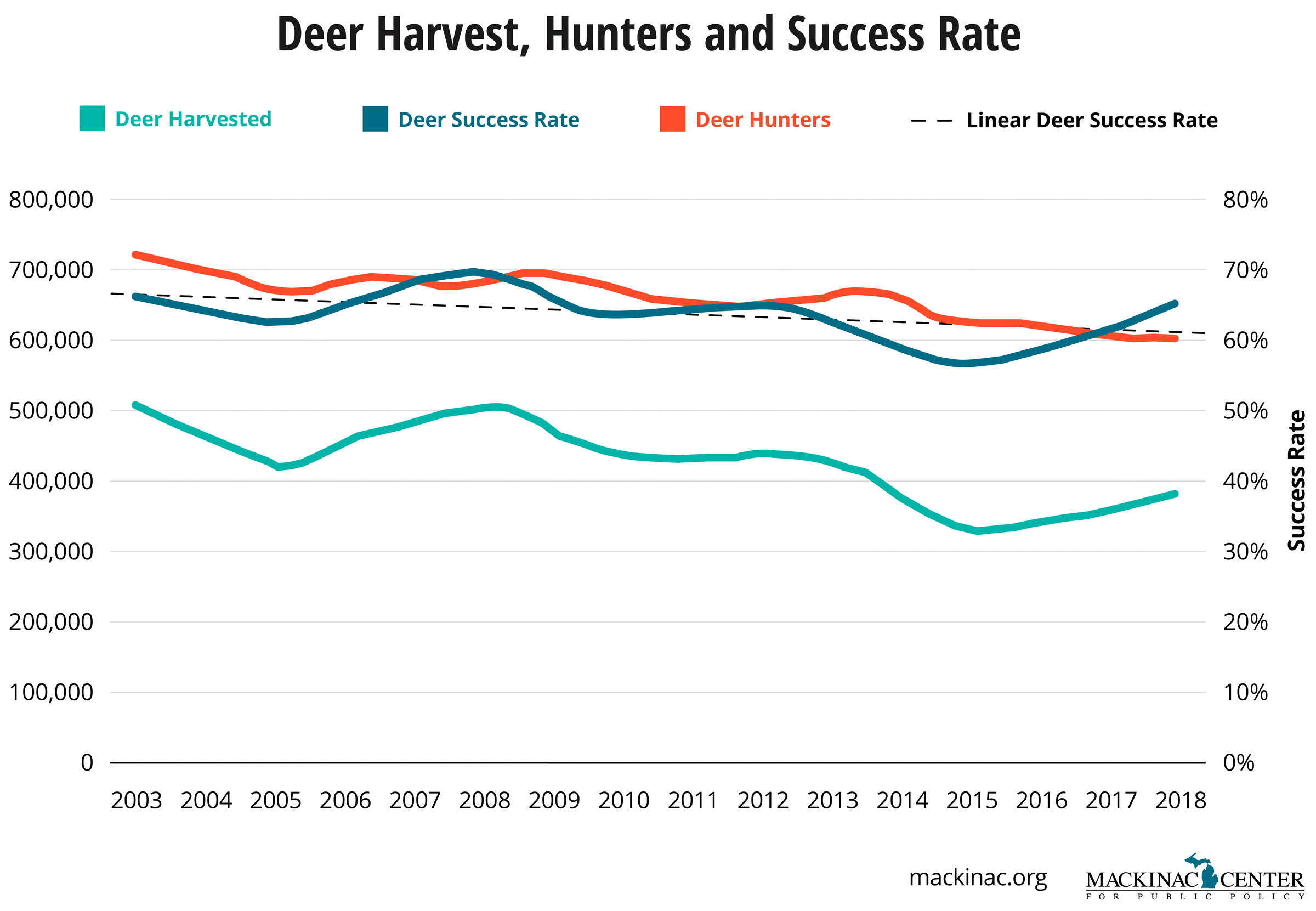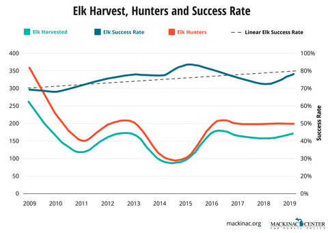 The public survey revealed widespread concern about deer predation. There are around 550,000 deer hunters in the state of Michigan, and hunting and fishing generates an estimated $11.2 billion a year in economic activity. Given this, wildlife managers cannot afford to ignore the potential impacts that wolves might have on deer hunting in Michigan. Using data from the DNR annual wildlife surveys, we considered hunting participation and the success rates associated with the harvest of different animals throughout the year. According to our calculations, while wolf populations have approached and stayed at capacity levels, deer hunting success rates have been constant over time and elk success rates have moderately increased. This suggests that a healthy wolf population has little to no impact on whether hunters are successful.