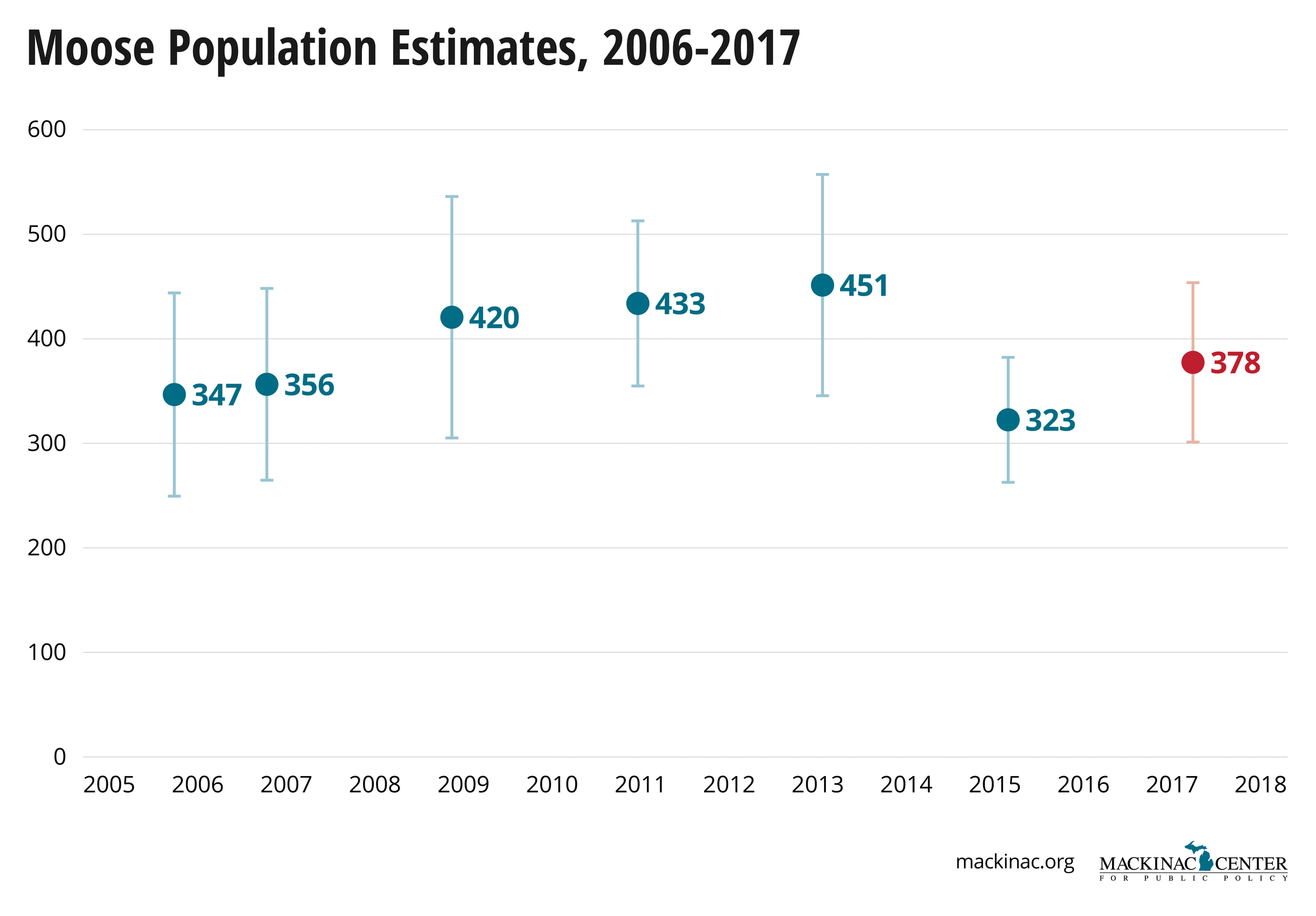 In addition to looking at deer and elk trends in Michigan, we considered moose populations in the state and any effect wolves may have had. The Michigan moose population is almost entirely in the western Upper Peninsula. The Department of Natural Resources estimates the moose population every two years.