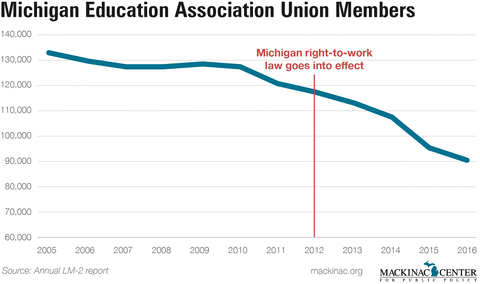 It isn’t surprising that Michigan Education Association membership was adversely affected when the state enacted a right-to-work law in 2013. But the union’s financial woes predate the law by many years.