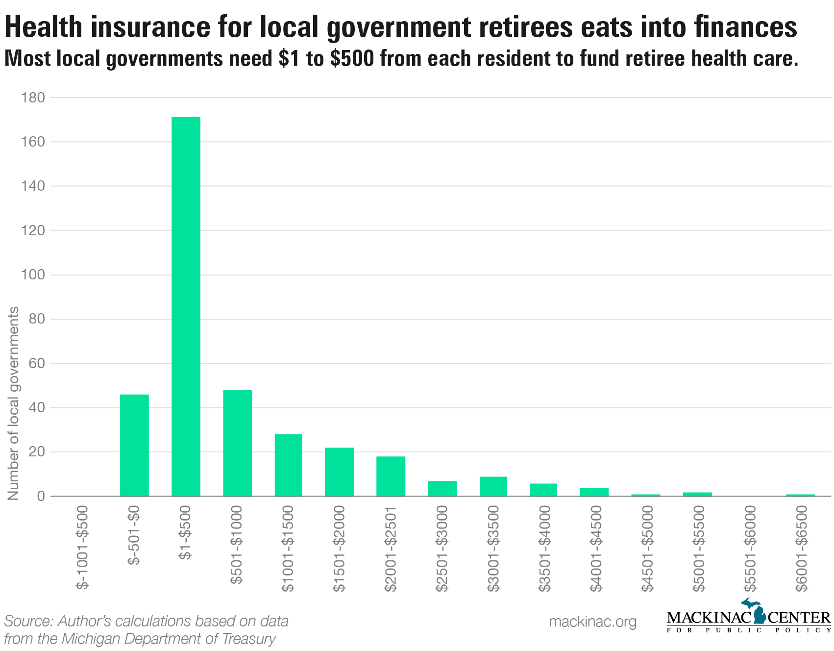 Local governments have a problem, however. The Michigan Treasury Department gathered data on 363 of the state’s general purpose governments — cities, villages, charter townships and counties. There are 46 governments — 13 percent of the total — that either did not offer retiree health insurance benefits to their employees or have set aside enough money to pay for them. The other 87 percent offer health benefits to retirees but have not saved enough money.