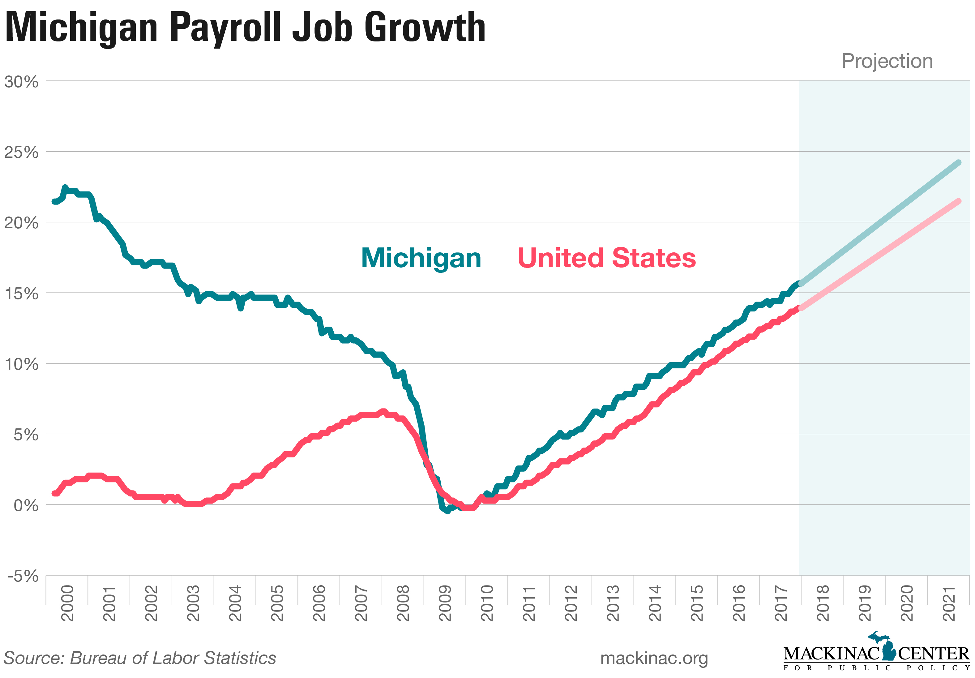 The chart below provides the details. It shows the number of jobs in Michigan and for the entire U.S. relative to low point of the Great Recession. In 2000, Michigan had 4.7 million jobs, about 22 percent more than existed at the trough of the Great Recession. The job growth Michigan experienced since the recession has almost undone the job loss that occurred from 2000 to 2009.