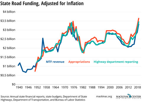 The state issues reports on its annual finances after its fiscal year concludes. Here you can find revenues for the Michigan Transportation Fund, which receives money from the state’s fuel and vehicle registration taxes as well as other state sources. We were able to get MTF revenues going back to 1940.