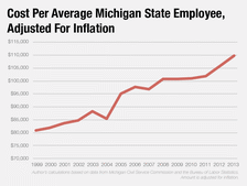 Retirement costs are another story. In the past few years, the primary increase in the cost of compensation is catching up on previous underfunding. There are gaps in Michigan's closed out pension system and the state is trying to prefund retiree health care benefits.