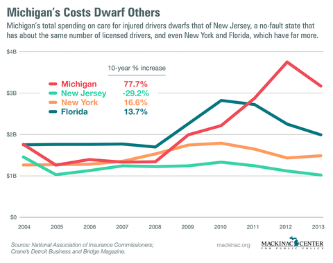 From 2004 to 2013, total spending on medical care for people injured in auto accidents in Michigan increased by 78 percent. In New Jersey, however, spending fell by 29 percent, even though the Garden State has close to the same number of drivers as Michigan. Total spending on medical care caused by auto accidents increased by 17 percent in New York and 14 percent in Florida. Those increases are significantly less than what Michigan has seen, despite the fact that these states have one-and-a-half to two times as many drivers as Michigan.