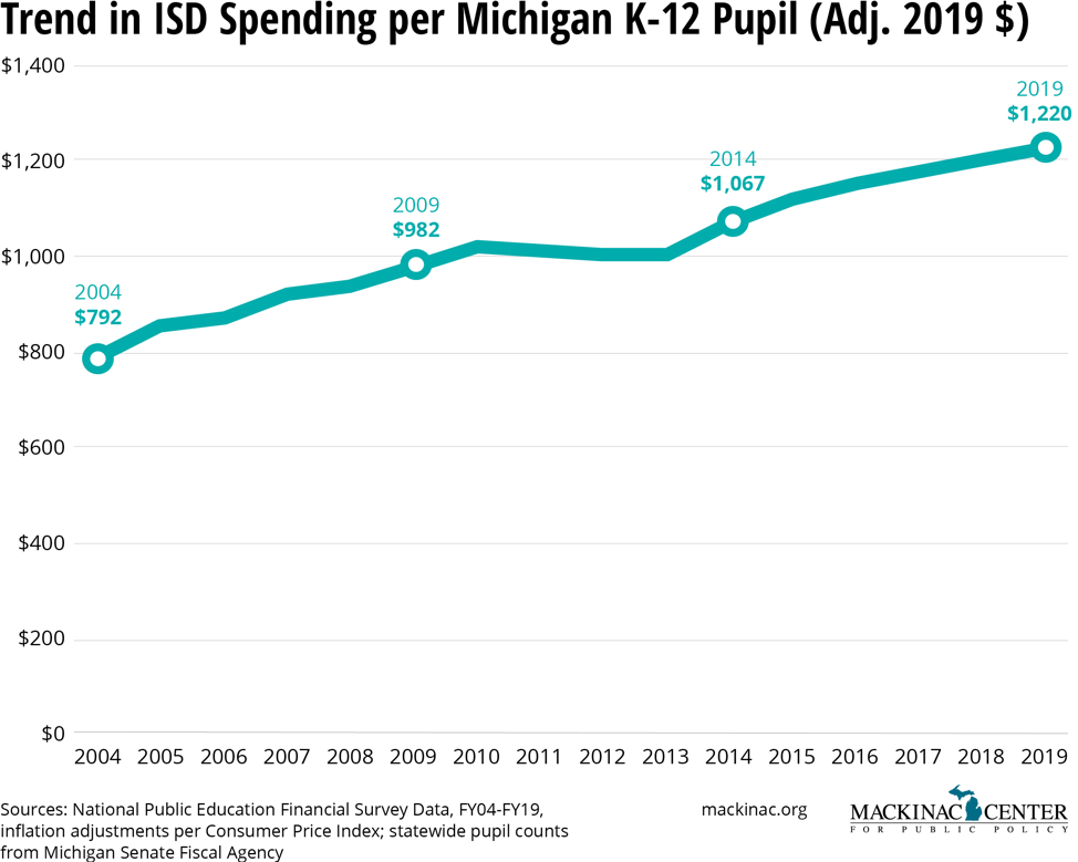 While ISDs accounted for 1 in every 16 dollars spent on Michigan K-12 education in 2004, by 2019, that figure was very nearly 1 in 10. If ISDs spent the same share of K-12 funds as they did in 2004, more than $650 million would be shifted to districts and charter schools, which operate closer to students and manage classrooms. That’s significantly more than the emergency federal education funding coming to help ease the budget cuts many local Michigan districts and charters will face due to revenues curtailed by the pandemic.
