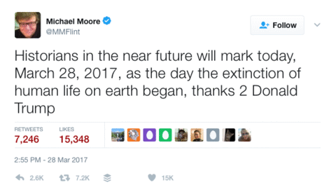 A frantic tweet by social and environmental activist Van Jones informed his followers, “@realDonaldTrump just signed a death warrant for Planet Earth.” And, not to be outdone, progressive filmmaker Michael Moore one-upped them all by tweeting his illogical prediction that, “Historians … will mark … March 28, 2017, as the day the extinction of human life on earth began, thanks 2 Donald Trump.”
