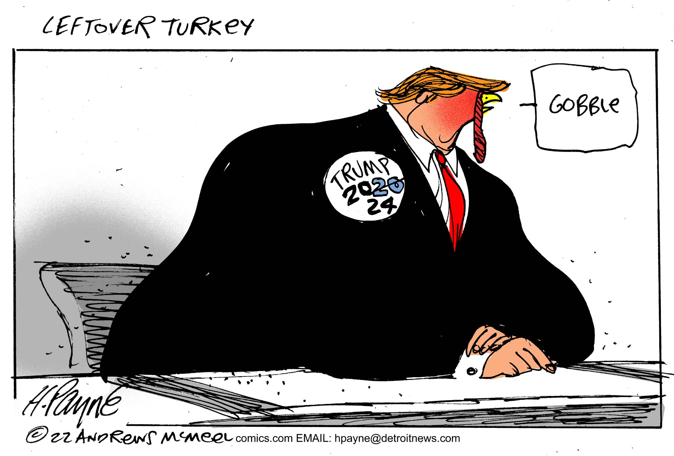 “I think Donald Trump did some remarkable things as president of the United States,” Payne says, “But I think at this point he’s become a bit of a joke.” So he depicts the former president as a turkey with a simple cut line in a cartoon to establish that he thinks Trump is yesterday’s news.