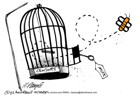 Payne’s intended effect of editorial cartoons is clarity and intensity. A good cartoon distills an idea to its essence and gives readers a strong feeling about it. He cites this cartoon about the Babylon Bee’s return to Twitter, after having been removed from the site by the social media platform’s moderators.