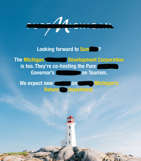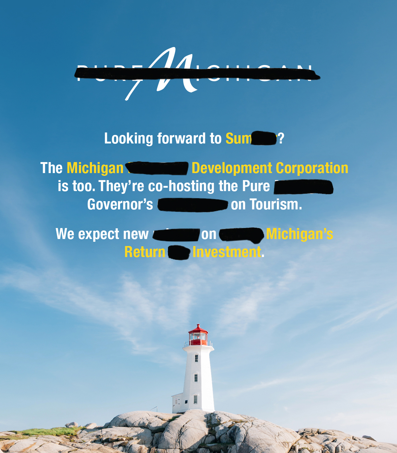 It is hard being deprived of useful information. The Michigan Economic Development Corporation claims the state’s $34 million in annual spending for “Pure Michigan” advertising produces high returns on investment. The analyses, however, rely on a dark methodology. Like the redacted text on the other side, taxpayers and others are not permitted to know how the ROI figures are calculated. This secrecy is unfair to taxpayers and makes a mockery of the MEDC’s claims for success.