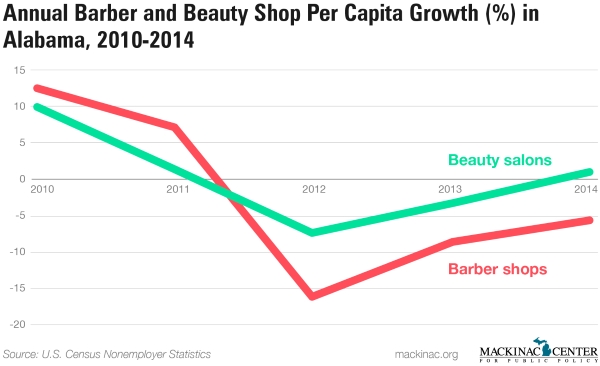 Barber shops per person in Alabama shrank from 2013 to 2014 — falling by 5.7 percent. Beauty shops per person, on the other hand, increased in from 2013 to 2014 — growing by nearly 1 percent for the year. The gap in growth rates between the two shops is approximately 6.7 percentage points. It is possible that consumers in Alabama may be choosing to substitute cosmetology services for barbering services with more frequency after licensing takes effect. This result is supportive of the hypothesis that barber licensing is primarily restricting competition as hypothesized by Friedman and Stigler.