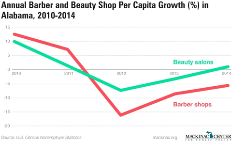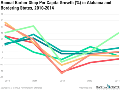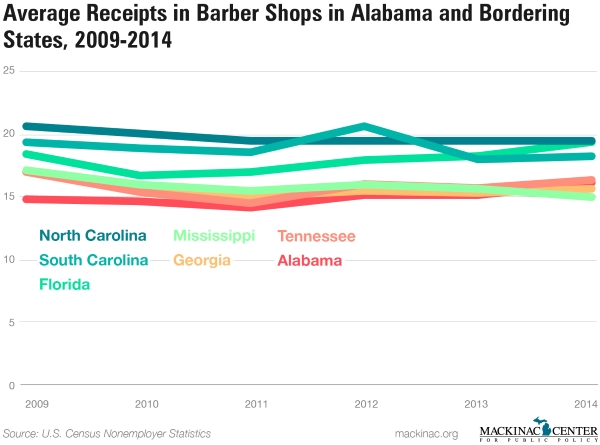 In this paper, I estimate the effects of Alabama’s reintroduction of barbering licensing requirements on the receipts and growth of barber shops in the state. I rely on U.S. Census Nonemployer Statistics data for 2009 to 2014. I perform state-level comparisons of barber and beauty shops in Alabama, as well as comparing these Alabama statistics to that of nearby bordering states. In addition, I compare data from Alabama border counties to data from contiguous counties in Georgia and Florida.