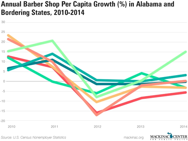 Graphic 4: Annual Barber Shop Per Capita Growth (%) in Alabama and Bordering States, 2010-2014