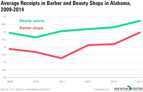 Average receipts for barber shops increased from $15,200 in 2013 to $15,970 in 2014, a 5.1 percent increase. Average receipts for beauty shops increased from $16,300 in 2013 to $16,700 in 2014, a 2.5 percent increase. Following the adoption of barber licensing in Alabama, barber shop average receipts grew faster — a 2.6 percentage point difference — than beauty shop receipts. This suggests that the new licensing requirements resulting in increased earnings for incumbent barbers and squares with the general agreement in economic theory.