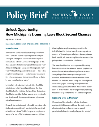 This policy brief argues that the state should reform its occupational licensing laws to remove the barriers that prevent people with criminal records from obtaining a license to work. State policymakers recently took steps in this direction, and the results demonstrate that these reforms can improve public safety and reduce prison costs for taxpayers. Allowing more people with criminal backgrounds to obtain state licenses means more of them will find steady employment, reducing the chance they reoffend and end up back in prison.