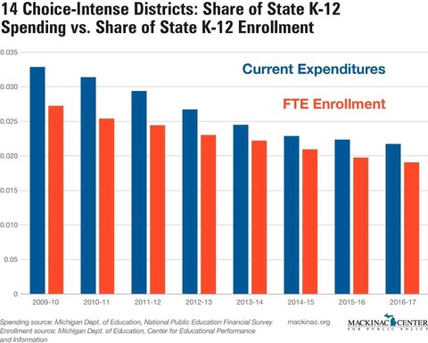 But consider this: In 2010, the 14 districts spent over 20 percent more than what their share of student enrollment would suggest. They served 2.7 percent of Michigan’s K-12 public school students but spent about 3.3 percent of Michigan’s K-12 public dollars. Seven years later, these districts still spend nearly 14 percent above the state average.