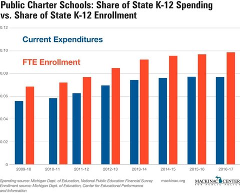 As was the case with the 14 choice-intense districts, per-pupil spending in Michigan’s charter schools changed very little from 2010 to 2017. But unlike those districts, charters have consistently spent between 18 and 22 percent less than their share of enrollment. Charter schools have no access to local property taxes and tend to get fewer federal dollars. Yet that has not hindered families who flock to them for results and opportunities.
