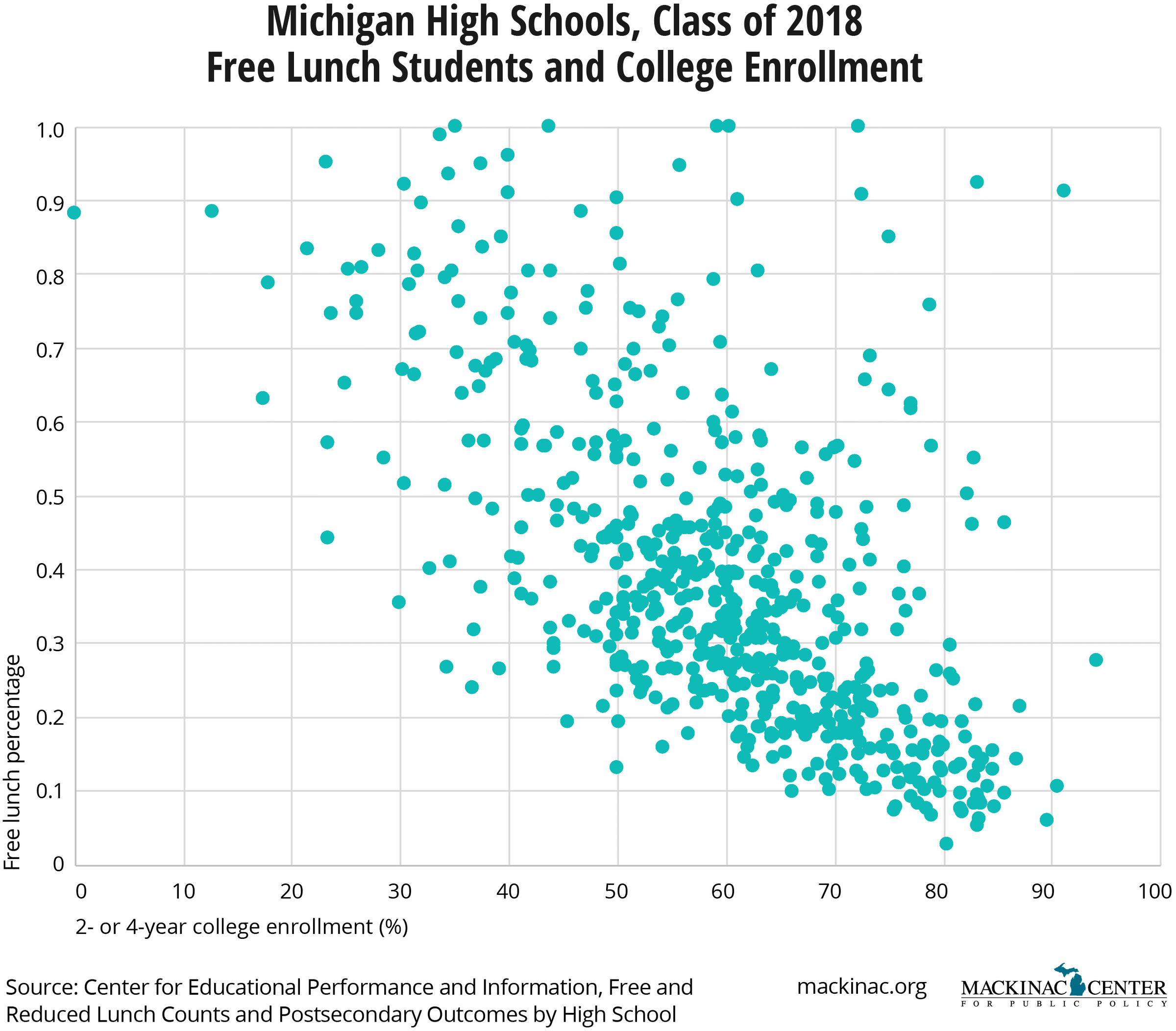 The Mackinac Center’s series of Context and Performance Report Cards have substantiated the well-known phenomenon that schools with poorer student populations tend to score lower on standardized tests. The connection can be clearly seen in comparing the rates of Michigan schools’ achievement rates on recent SAT and M-STEP tests with the shares of students receiving free lunch subsidies due to family poverty.