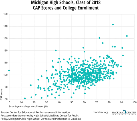 One final point of interest is that higher CAP Scores correlate positively with college enrollment even when considering low-income students on their own. The average school in Michigan sends economically disadvantaged students to college at a rate of approximately 50%. This drops to only 39% for high schools with less than a 93 CAP Score, but jumps to 61% those with a score of 107 or higher.