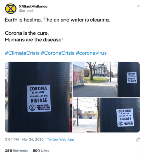 For example, on March 24, a Twitter account claiming to be members of a United Kingdom-based chapter of the environmental group Extinction Rebellion proudly posted pictures of fliers they had hung in their area proclaiming, “Corona is the cure. Humans are the disease.” The text accompanying the photos claimed that virus-related restrictions on human activity were allowing the Earth to heal and that “the air and water is clearing.” To their credit, many other XR affiliates defended the value of human life and society. They immediately practiced social (media) distancing from the post by urging their fellow members to rethink and remove their statement. The account has since been suspended.