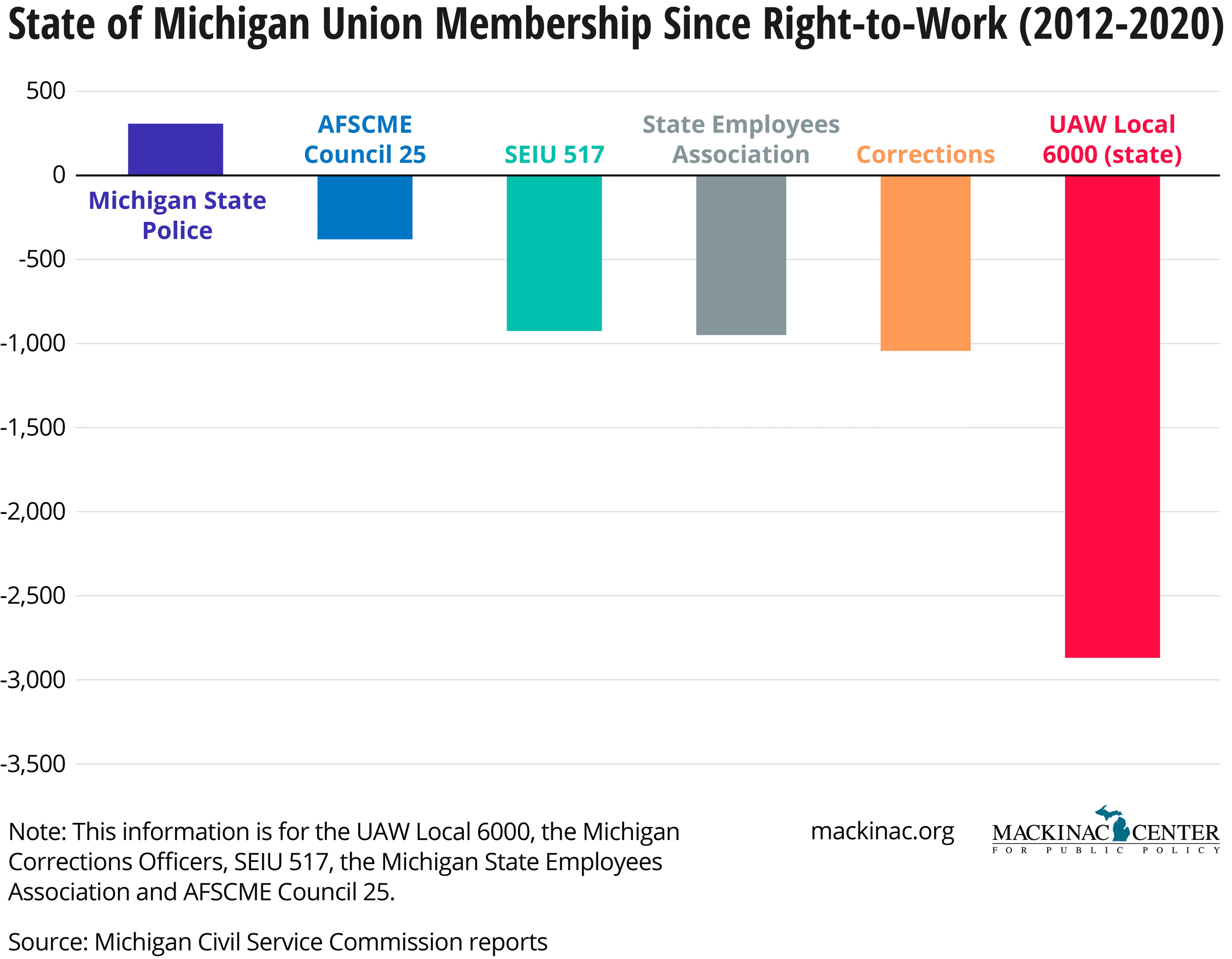 Michigan’s right-to-work law went into effect in 2013. Since then, the state has hired thousands of workers, but total membership in state unions has declined by more than 5,000.