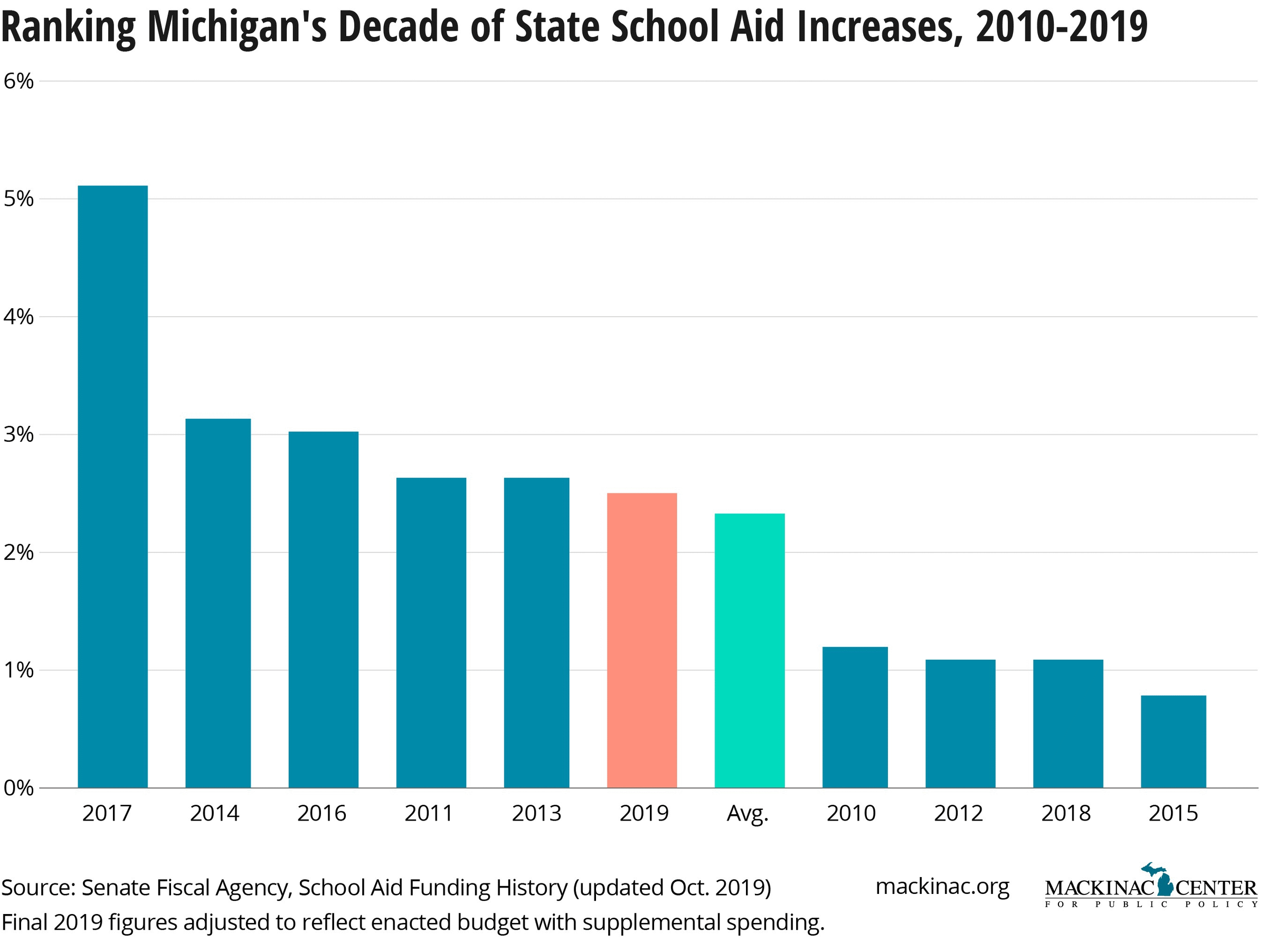 Senate Bill 154, the school aid supplemental spending agreement, adds back $70.5 million of the more than $128 million Whitmer removed from the $13.5 billion education funding package with her controversial line-item veto. Reapproving this share of the vetoed funding places this year’s 2.51% increase above the average for the past 10 years. In fact, this year’s increase very nearly matches the largest school aid hike during the Jennifer Granholm administration (the 2007 budget).