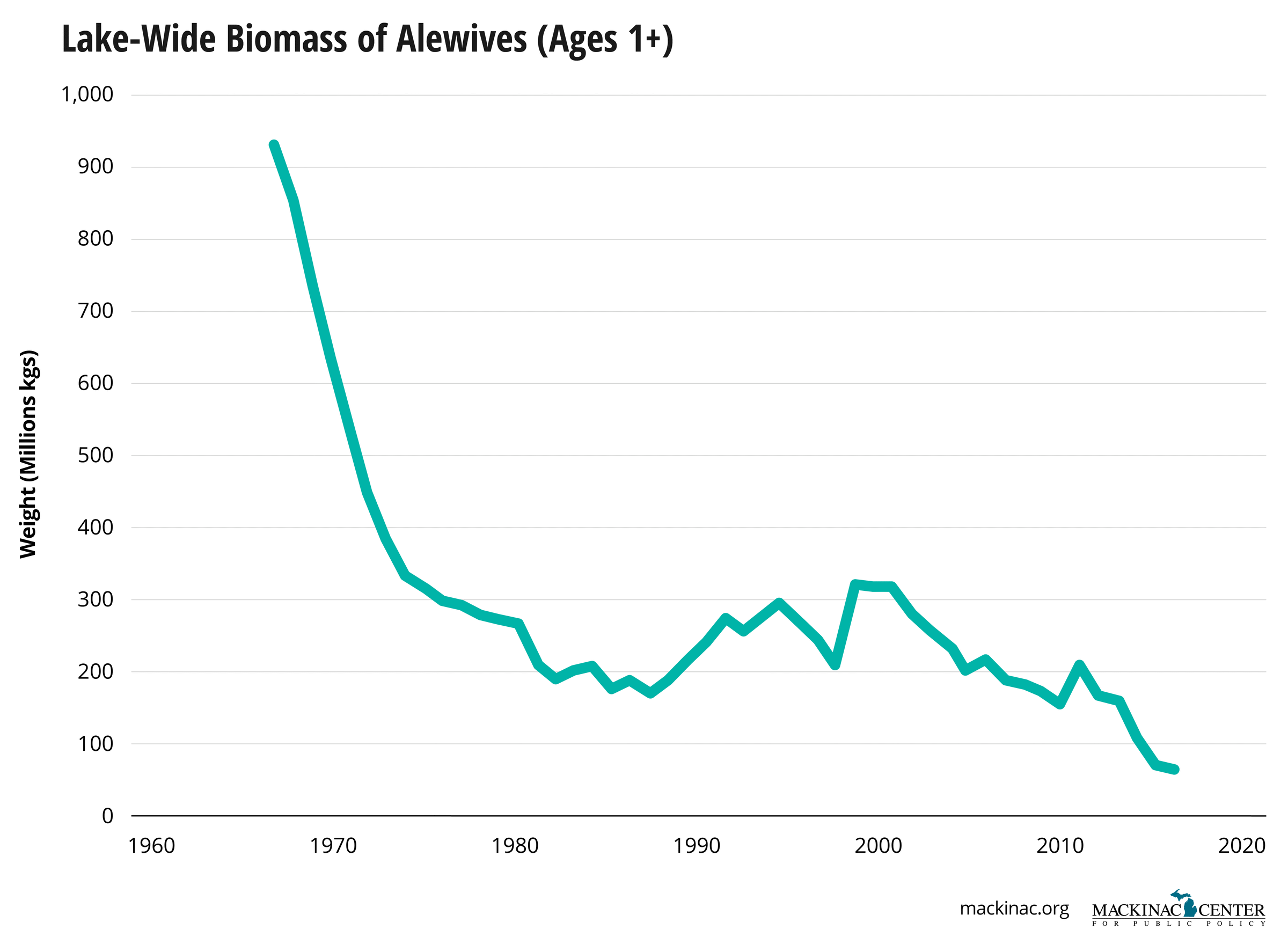The state introduced salmon as a way to curb an explosion of alewife, an invasive species of herring that probably was introduced to the Great Lakes in the late 19th and early 20th centuries. On that point, the salmon appear to have been wildly successful. The number of alewives in the lakes has decreased substantially over the past several decades.