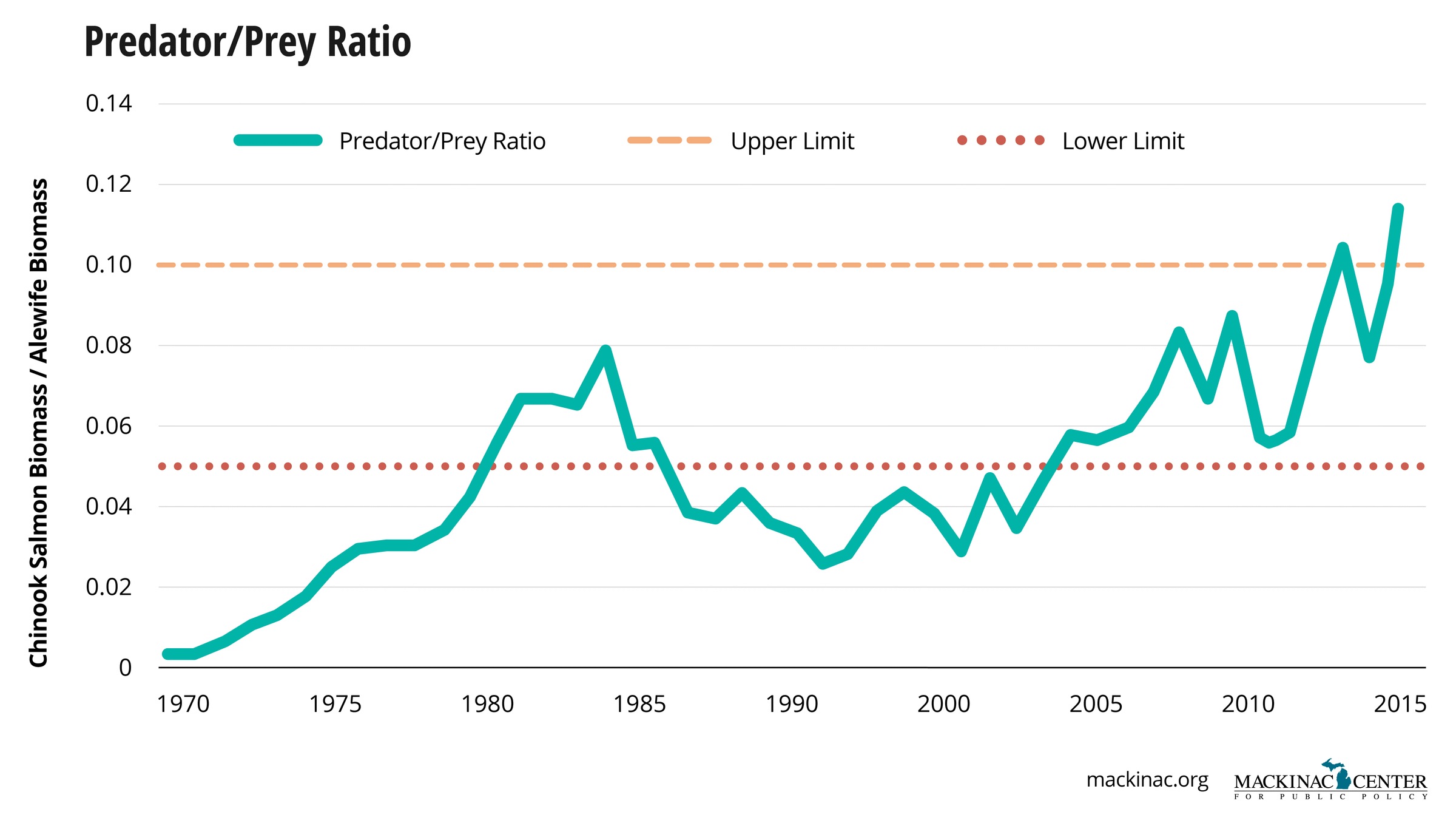 The DNR manages its stocking work by, among other things, looking at ratio of predators to prey. These predator-prey ratios are relatively simple measurements that approximate how much biomass a predator species has (in brief, its volume) compared to the biomass of a prey species. The DNR has established as its goal a ratio of 0.05 for chinook salmon in Lake Michigan (i.e., 5 pounds of chinook salmon for every 100 pounds of alewife). But in recent years — as the alewife population has decreased — the PPR has risen above 0.10, prompting the DNR to decrease stocking as it aims to bring the ratio back to 0.05. This decrease in stocking numbers will inevitably decrease salmon harvests by Michigan’s sport and commercial fisheries. These decreases are likely to decrease overall access to salmon as a food source for Michigan residents.