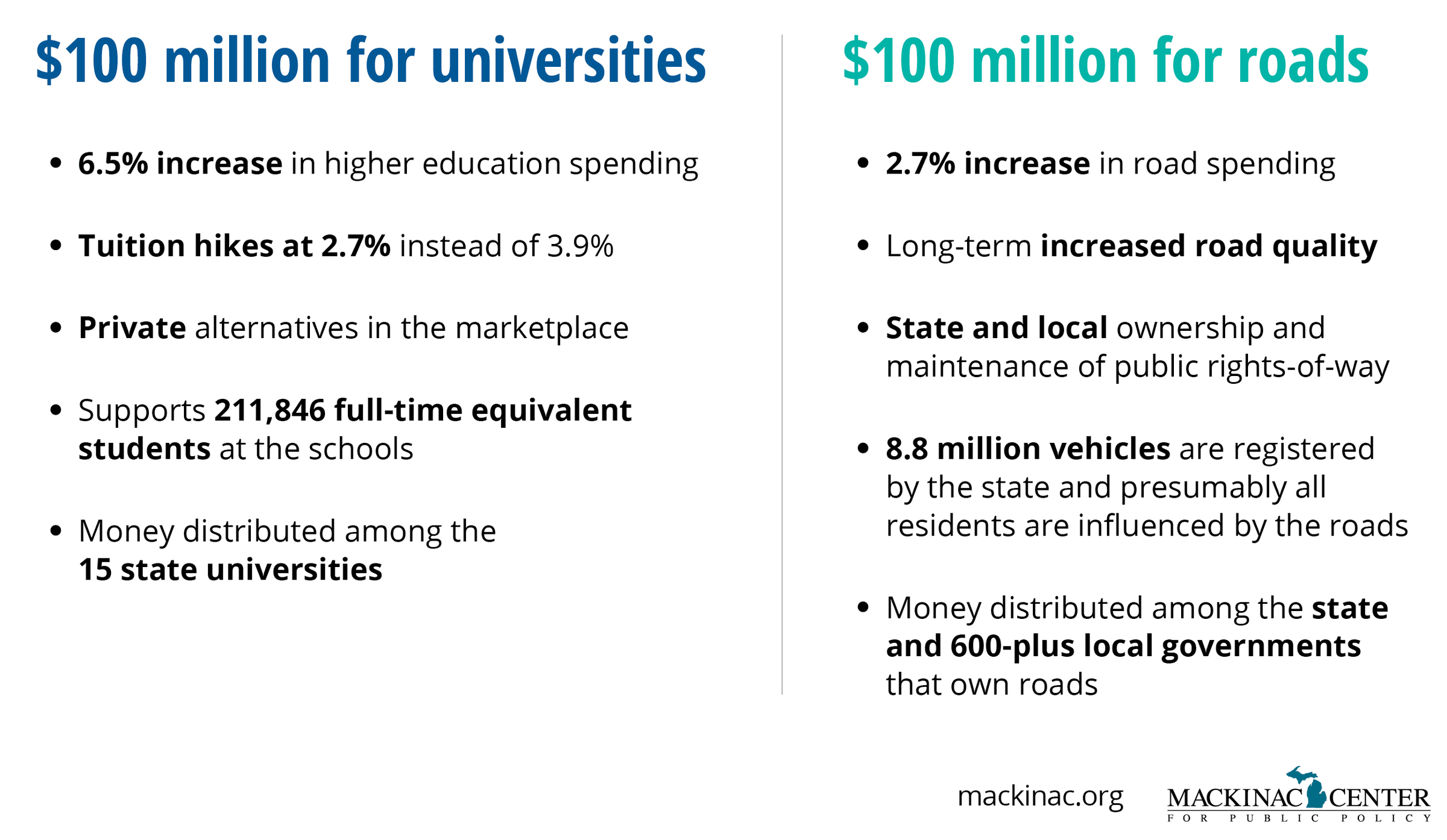 To show why the state should prefer extra road funding over extra university funding, here is a comparison between general university spending and road funding, and what would happen if either one were increased by $100 million each year.