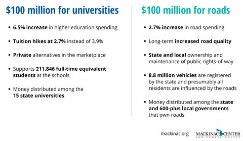 So, the state could send extra money to Michigan universities, hoping they wouldn’t increase in-state tuition as much. Or, lawmakers could use the money on roads, to improve them faster than would otherwise be the case. Residents get a better deal on the roads.