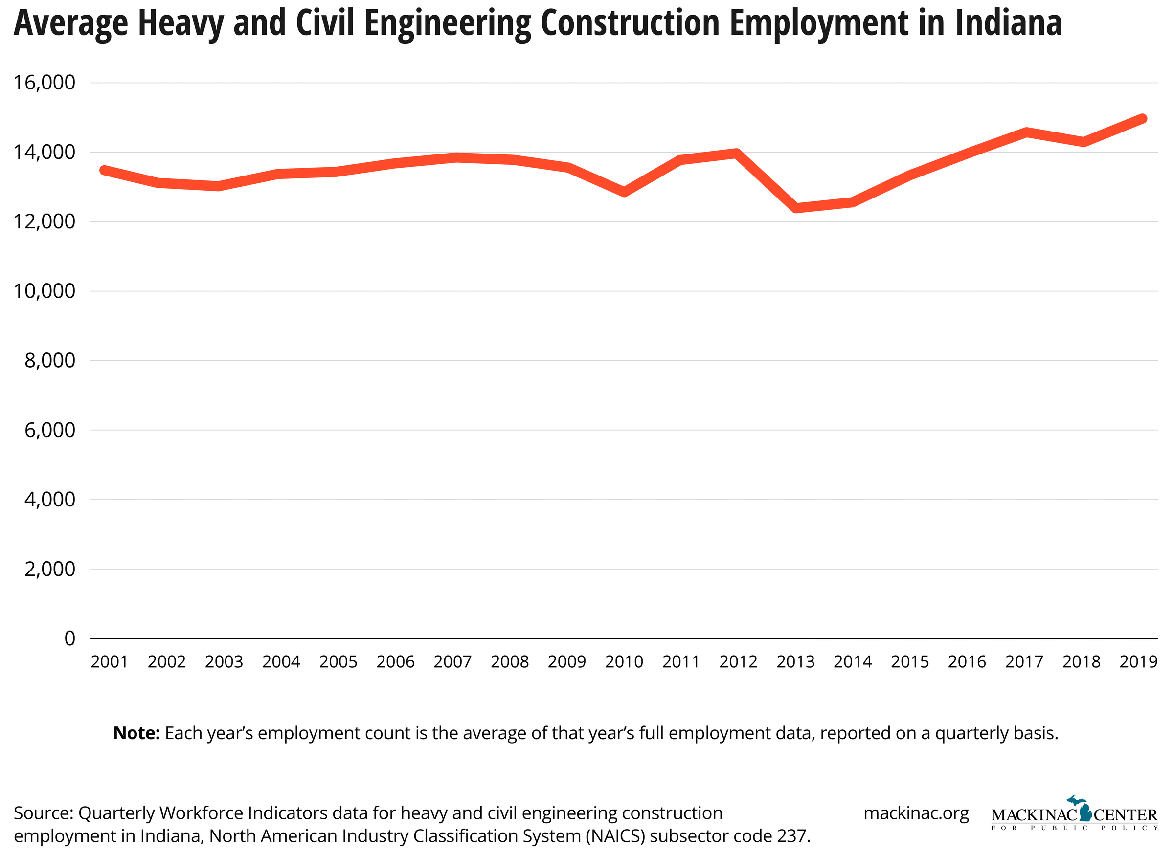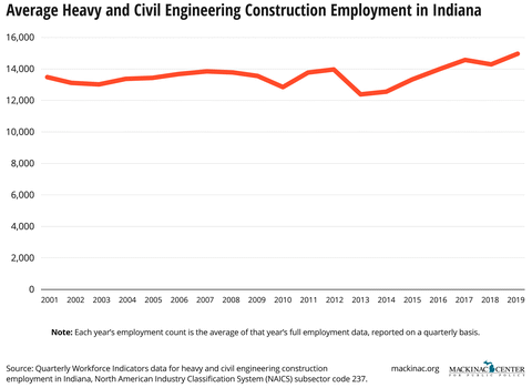 The report correctly states that public works construction employment in Indiana – as measured in the “heavy and civil engineering construction” job classification – increased after the state repealed the mandate. Employment grew about 12% between 2015 and 2019, from 13,373 to 14,985. As the nearby graph shows, 2019 employment in that sector was at an all-time high. That’s thanks to a steadily upward trajectory that began in 2015, the year prevailing wage ended.