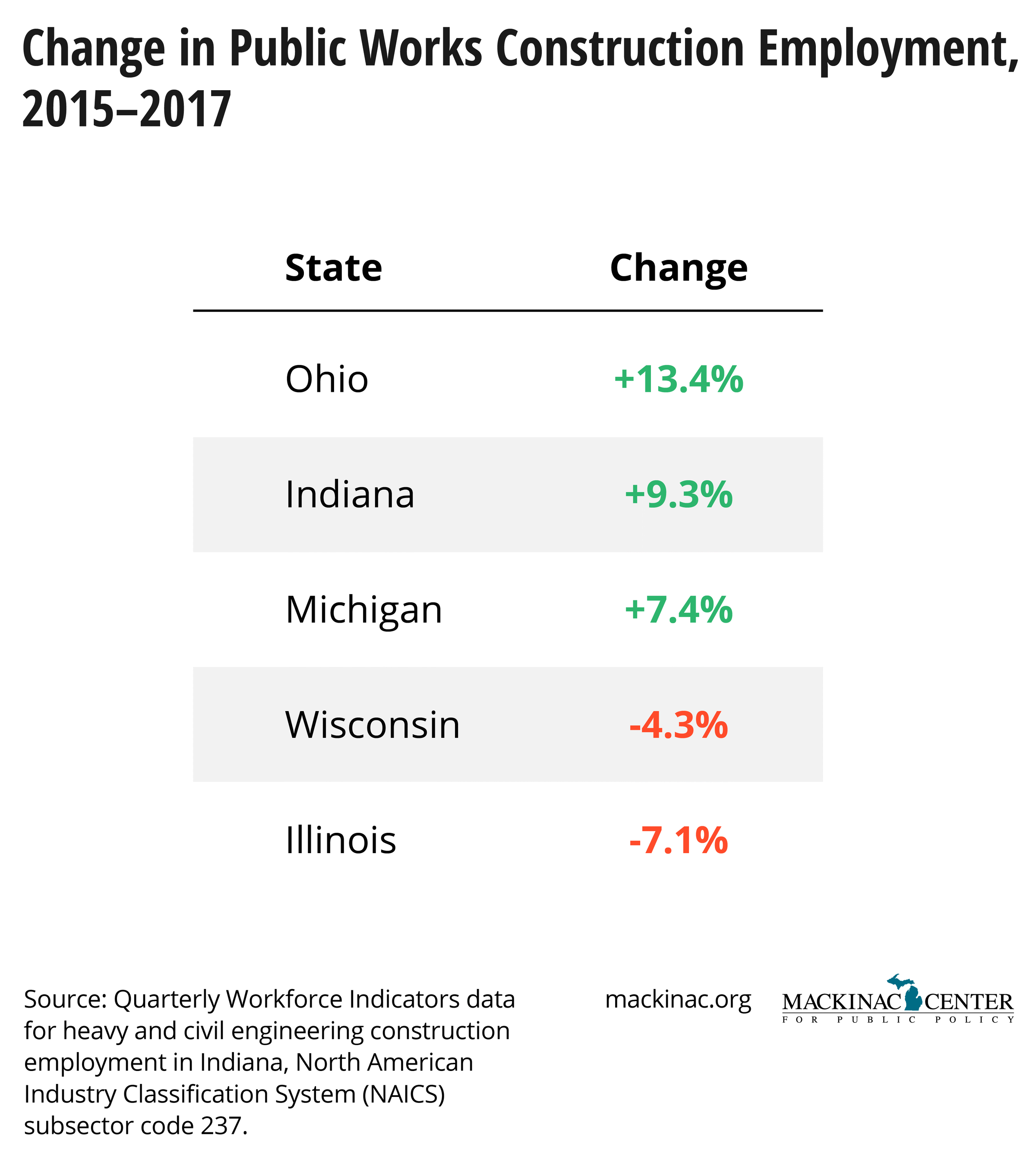 Not surprisingly, a more comprehensive look at the QWI data calls the institute’s claims into question. As the nearby table shows, public works construction employment from 2015 through 2017 increased in three out of five Midwestern states. Indiana’s gain was the second-highest.